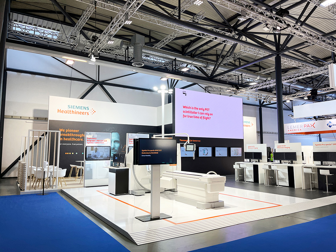 Zu verschiedenen Veranstaltungen wie z. B. die EANM, die ECR, die EuroMedLab und dem RÖKO Röntgenkongress betreuen wir die Firma Siemens nun schon seit Jahren mit unserer Lichtmastfamilie. Das klare Design der Lichtmasten fügt sich wunderbar in die Standarchitektur ein und beleuchtet den Messestand taghell. Abb.: Beleuchtung der Messestände zur EANM2023 in Wien und EuroMedLab2025 in Brüssel.
